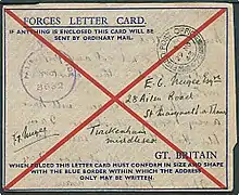 A postal stationery airmail letter sheet, entitled "Forces Letter Card", now commonly known as an aerogram, was made available during World War II for British military forces[7] and a few were issued with a large St. Andrew's cross printed on the front portion of the air letter.[8]