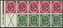 The crosses are the same color as their respective stamps and occur in two different types. They are either colored on a white background or the other way around. They are always found in the last row of the sheet and can either be placed in the center or on the left or the right edge.
