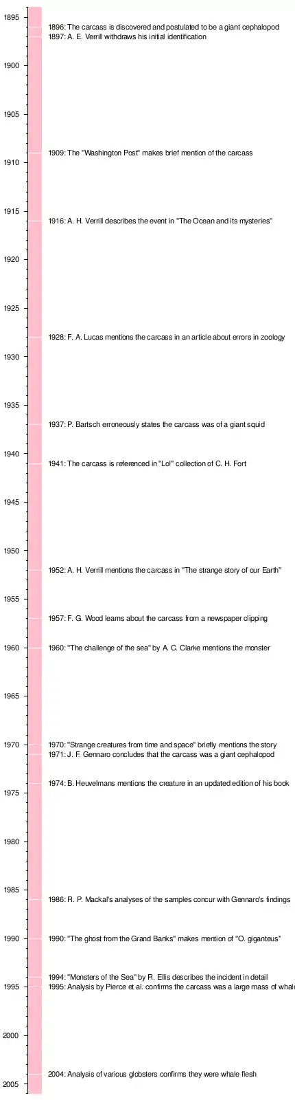 Between January 9 and January 15, a storm tide dragged the carcass out to sea, but it washed ashore again on the next tide, on Crescent Beach, two miles to the south of its original location. Webb sent photographs of the mass, along with a description, to Joel Asaph Allen of the Museum of Comparative Zoology at Harvard. Allen apparently did not respond, but Webb's letter came to the attention of Prof. Addison Emery Verrill of Yale, at that time the foremost authority on cephalopods in the country. At first, Verrill suggested the carcass might represent the remains of a giant squid. In the January 1897 issue of the American Journal of Science he wrote:[7]