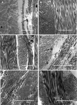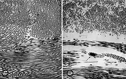 Now differences between the contemporary squid and octopus samples became very clear. In the octopus, broad bands of fibers passed across the plane of the tissue and were separated by equally broad bands arranged in a perpendicular direction. In the squid there were narrower but also relatively broad bundles arranged in the plane of the section, separated by thin partitions of perpendicular fibers.