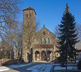 With industrialisation in the late 19th century, families especially from the Eichsfeld area increased the number of Catholics in Döhren.[1] The only Catholic church of Hanover then was St. Clemens. In 1887, a Catholic school was built. The present church was designed by Christoph Hehl in Romanesque revival style as a basilica with three naves. In the beginning, only one nave was built, without transept and choir. The missing elements were added in 1959.[1] The church was consecrated on 8 September 1893, dedicated to Saint Bernward. He had become bishop of Hildesheim 900 years earlier, and the consecration was performed by his successor Daniel Wilhelm Sommerwerck.[1]