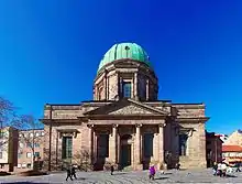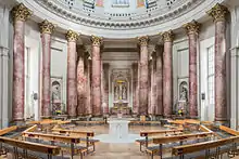 The old church building was demolished in 1784. Franz Ignaz Michael Neumann, son of Balthasar Neumann, drew up plans for the new building and its foundation stone was laid on 19 May 1785. Neumann died on 29 September 1789, and his responsibilities were taken up by Peter Anton von Verschaffelt, who resigned in 1789 because his spending was exceeding the budget. The topping off was completed in 1802 and the dome was crowned with a golden cross in 1803.