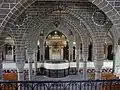 The church is the largest Armenian church in the Middle East.[4][5][6] It is estimated that it could contain around 3000 worshippers.[3][1] Its rectangular floor plan measures around 31 meters long and 35 meters wide.[1] Inside, the church has a hypostyle form with a flat roof supported by three rows of arches that divide the space into four transverse "naves".[2] In total, 20 arches are supported by 16 monolithic columns.[1] Further inside was a second floor that was used by women.[1][3] The church is unique in having seven altars: five on the ground floor along the eastern wall and two more on the second floor.[3][1] On the exterior, the church is fronted by an arched portico and a bell tower. The church is also adjoined by a Patriarchate building, residence, wells, and three courtyards which are all part of the compound.[3]
