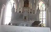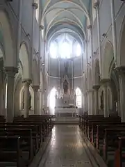 Columns are the main structural elements of the church. These columns are creating form of the main corridor and it carries the arch roof. Building has got many colons, besides the columns view that architectural element. These columns only complete the roof composition. It's possible to see these types of columns behind the altar, which is located at apse. The elevation of the church has high quality. Also, it is easy to say that although interior needed restoration, the elevation does not need anything. Especially, the brick and concrete are important considering the age of church. The only vibrant colors used in the window that are called as stained glass in architecture.