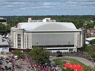 St. John Arena is a multi-purpose arena on the campus of Ohio State University in Columbus, Ohio, United States. The arena was named for Lynn St. John, who served as Ohio State's men's basketball coach and athletic director until 1947. It was designed by Howard Dwight Smith, architect of Ohio Stadium. It opened in 1956 to serve as the home of multiple Buckeye athletic teams, primarily the men's basketball team. Prior to its construction, the men's basketball team played off-campus in the Fairgrounds Coliseum at the state fairgrounds. St. John Arena served as home of the men's and women's basketball teams until it was replaced by Value City Arena in 1998, while the remaining tenants moved to the Covelli Center in 2019. It is still occasionally used by the men's and women's basketball teams for games and is used before every OSU football home game for The Ohio State University Marching Band's Skull Session.