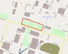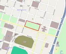 Kiener Plaza occupies the full width of the Mall between North 7th Street and North Broadway. It sits immediately north of the Ballpark Village, developed in the early 21st century. The land is owned by Southern Real Estate and Financial Company and leased to the city of St. Louis.[3]