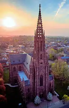 The historic Gothic Revival third church is located at 35 Edward Street. The church is laid out in a Latin-cross floor plan and features a 245 ft octagonal Medina sandstone steeple with a Seth Thomas clock. Above the steeple rests a 72 ft pierced spire; reputed to be the tallest open-work spire ever built completely of stone (without reinforcement) in USA.[1]