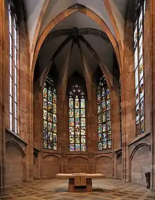 On 5 June 2014 a fire broke out leaving the interior devastated and severely affecting the church's structural integrity. Fortunately the stained-glass windows in the chancel had been removed beforehand due to renovations and thus weren't damaged.[1] It was decided not to reconstruct the church in its original state. Instead a modern interior design by architect Florian Nagler was adopted. A simple, raised wooden ceiling encloses the restored walls which still show traces of the fire. The chancel remains in its historical shape, decorated with the stained windows. During restoration and reconstruction works the parish held its service in neighbouring St.Klara church. St. Martha was reopened on 10 November 2018.[2]