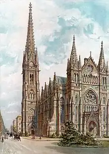 The church is built in a Gothic Revival style. It has the highest tower of any church in Leipzig, at 87 metres (285 ft).[3] Its exterior is richly decorated, with stained-glass windows and a large portal on the western side.[7]