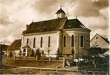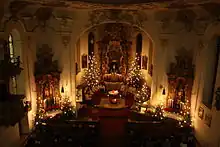In Frankish times, around the year 800, the first church was built in Amendingen, presumably as a simple wooden building.[2] The parish was first mentioned in a document in 1341, when Heinrich III von Schönegg, Bishop of Augsburg, incorporated it into the Rot an der Rot abbey, which belonged to the diocese of Constance, with the approval of the antipope Nicholas V. The church was then incorporated into the diocese of Augsburg. This meant that the Rot abbey owned half of the major tithe associated with the right of patronage. In 1422, Bishop Anselm von Nenningen imposed an interdict on the parish, which was lifted at the request of the Duke of Teck at the feast of Pentecost.[3] In 1477, the Buxheim Charterhouse bought the other half of the major tithe and thus half of the patronage right. St. Ulrich was first mentioned as patron of the church in 1484. A visitation report of 1575 describes that the high altar had sculptures of Ulrich, Theotokos, and St. Catherine.[4]