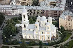 59°57′06″N 30°17′43″E / 59.9518°N 30.2954°E / 59.9518; 30.2954 The Prince St. Vladimir's Cathedral (Russian: Князь-Владимирский Собор), formally the Cathedral of St. Equal to the Apostles Prince Vladimir (собор Святого равноапостольного князя Владимира) is a Russian Orthodox cathedral in Saint Petersburg, Russia. It is located on Blokhin Street in the Petrogradsky District of the city across the Malaya Neva from the Spit of Vasilevsky Island, in close proximity to the Sportivnaya metro station.