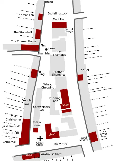 In the thirteenth century, many of the stalls gave way to permanent building and shops and by 1355 large parts of Market Place had been built over. In the earlier part of the thirteenth century, fees are recorded for stalls in the Market Place but in the next century the term shops supersedes that of stalls.[3]