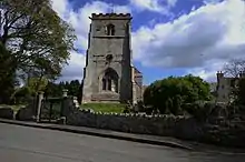 The church's tower with the gate piers in front re-using Roman materials.