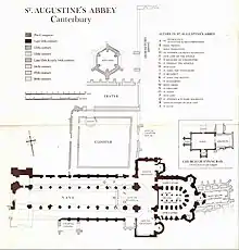 - ↑ Judith Roebuck, St Augustine's Abbey (English Heritage, 1997), 11 and G. F. Maclear, S. Augustine's, Canterbury: Its Rise, Ruin, and Restoration (Wells Gardner, Darton, & Co., 1888) 27.