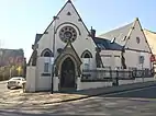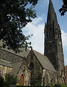 St Augustine's Church, Wrangthorn, usually referred to as simply Wrangthorn, is the church of the parish of Woodhouse and Wrangthorn, Leeds, West Yorkshire, England. It is near Hyde Park Corner at the top of Woodhouse Moor. It shares a benefice and clergy with St George's Church in the city centre, although the parishes remain separate. It was paid for by the Leeds Church Extension Society in 1866 and completed in 1871. The church, which is a Grade II listed building[4] is on a ridge of land between Meanwood Beck and the Aire Valley, on the north-west side of the city. Its architect, James Barlow Fraser (1835–1922), took advantage of this prominent location by including a three-stage pointed steeple; its blackened stone is a local landmark. The church is built in local gritstone ashlar in the Gothic Revival style and is adjoined by the smaller church hall of 1934.