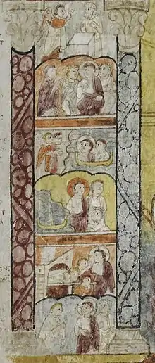 The manuscript once contained evangelist portraits for all four Evangelists, preceding their gospel, a usual feature of illuminated Gospel books, and at least three further pages of narrative scenes, one following each portrait page.[15] Only the two pages preceding Luke have survived. However the surviving total of twenty-four small scenes from the Life of Christ are very rare survivals and of great interest in the history of Christian iconography, especially as they come from the old Western Empire – the only comparable narrative Gospel cycles from manuscripts in the period are Greek, notably the Rossano Gospels,[16] and Sinope Gospels, or the Syriac Rabbula Gospels. The equivalent Old Testament cycles are more varied however, including the Greek Vienna Genesis and Cotton Genesis, the Latin Ashburnham Pentateuch, the Quedlinburg Itala fragment, and some others.