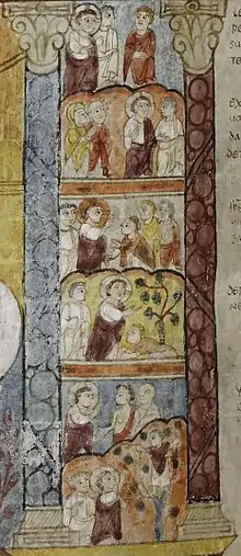 - ↑ According to Wormald in the Cambridge History cited above, the "parable of the fig tree" (Luke 13, 6–9), which precedes the miracle of the bent woman (Luke 13, 11–13).