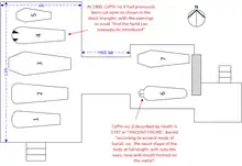| Coffin 6 - 5'7" by 1'3" | Ancient Figure - Buried “according to ancient mode of burial, viz., the exact shape of the body at full length, with only the eyes, nose and mouth formed on the metal”.[10] | ||