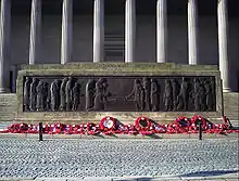 This is the flat space between the hall and the railway station and contains statues of four lions by Nicholl and cast iron lamp standards with dolphin bases. Also on the plateau are monuments, including equestrian bronzes of Prince Albert and Queen Victoria by Thomas Thornycroft, and a monument to Major-General William Earle by Birch. Between the equestrian statues is the Grade I Liverpool Cenotaph which was unveiled in 1930, designed by L. B. Budden and sculpted by H. Tyson Smith. It consists of a simple horizontal block with a bronze relief measuring over 31 feet (9 m) on each side. Sharples and Pollard regard it as one of the most remarkable war memorials in the country.[20]