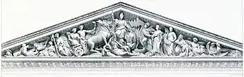 The tympanum in the pediment above the south portico once contained sculptures of Britannia enthroned at the centre protecting agriculture and the arts and offering an olive branch to the four quarters of the globe, carved by William Nicholl;