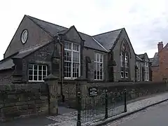 The school was designed by William Bourne, who also designed the nearby church of St James and St John. The design was intended to reflect its support from the church.[1] The school cost just under £500 with the majority of the funds being raised by public subscription.[2] The running costs were to be raised by annual sermons, public donations and the two pennies that the children paid for their schooling every Monday morning.[3] The school opened in 1842 and fund raising methods included the selling of medallions in order that the school could be of sufficient size to accommodate 300 pupils with a new extension at the rear. An alternative estimate was that the two rooms, which could be divided by a partition, were the main focus for a school roll of 200 pupils. They were separated mainly by gender, either side in three or four classes.[3] Early documents referred to each side of the partition as the boys' school and the girls' school. Religious education was emphasised by concentration on the catechism, church doctrine and principles being taught twice every week. The Bible was to be read daily.[4]
