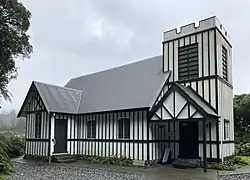 St James' Church is an heritage-listed Anglican church located in Franz Josef on the West Coast of the South Island of New Zealand. Set in a garden setting, the church was built in 1931 in a Tudor Revival style and is notable for its use of clear glass windows and the view over Waiho Gorge from its altar. This view originally included Franz Josef Glacier, a famous scene recorded on a 1946 Peace Stamp, but the glacier has since receded.