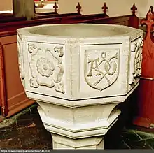 The pre-Reformation stone baptismal font came from the ruined church at Kinkell near Inverurie. Alexander Galloway was the rector of Kinkell from 1516 until his death in 1552 and the font bears his initials on the West panel. The bowl is octagonal with sunken panels on each face.[8] The bowl sits on a pedestal which was designed by the Aberdeen architect James Mitchell who provided the setting in 1851 when it was installed in St John's.