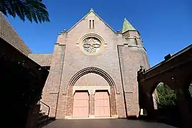 The church is an Inter-war Gothic building with a gable running north–south for the full length of the building. Hipped octagonal transepts project on the eastern and western sides. Entry is from the courtyard at the northern end. An octagonal stair turret, with copper spire, on the north west corner, leads up to the organ gallery above the entry. A square bell tower (minus bells) is located at the south-western corner of the building and dominates the view from the south, the main approach to the complex. Stone string courses and darker brick bands run around the building and stone copings cap the gables. The windows are set in stone tracery with stone heads and sills.[1]