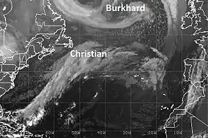 A depression formed off the east coast of the United States and headed east, assisted by the jet stream.[13] The St. Jude storm formed in the western Atlantic as a secondary low on the southern flanks of an area of low pressure to the east of southern Greenland; this Icelandic Low was named "Burkhard" by the Free University of Berlin.[14] The St. Jude storm formed from a wave front on 26 October in the northwest Atlantic off the Eastern seaboard of North America.[15] The developing low moved under the jet stream passing by the remnants of ex-tropical storm Lorenzo situated in the mid Atlantic.[15][16] The tropical air from this storm provided an input of energy,[17] strengthening the jetstream, and helping to intensify the deepening of the low in an area closer to Europe than usual. This, together with a strong jet stream, led to a rapid deepening of the St. Jude low before it hit western Europe as a strengthening storm. The storm has been cited as both meeting and not meeting the strict criteria of explosive deepening.[18][19] The storm system was swept across the Atlantic at a rapid pace moving eastwards with an average speed of 77 km/h (48 mph), and crossed over 2,000 km (1,200 mi) in less than 26 hours.[20]