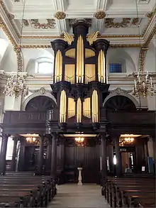 Inside, Wren's church has an aisle on the north side only, divided from the nave by Corinthian columns, carrying an entablature that continues around the walls of the main body of the church, where it is supported on pilasters.[9] The ceiling is divided into sunken panels, ornamented with wreaths and branches.[6] The church is 81 feet long and 68 feet wide.[10]