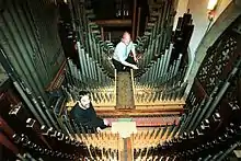 Roger FiField (centre) and Rowan Almet (left) during the installation of the current organ at St Mary's Hinckley