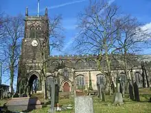 The churchyard walls, gateways and railings to south-east and north of the church are listed at Grade II.[10] The churchyard contains the war graves of fourteen service personnel, eleven of World War I and three of World War II.[11]