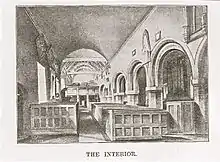 The church was transferred from St Davids into the diocese of St Asaph in 1849. In 1853, a report by T. H. Wyatt stated that the structure was in an unsatisfactory condition and should be pulled down but, other than some repairs to the tower, no action was taken.[16] Archdeacon Thomas provides an illustration which shows the interior of Kerry church before the restoration of 1883.[17] The illustration is from the chancel looking down the nave and shows the old box pews. Memorials, now on the west wall are shown above the nave arcade and opposite them are the hatchments now on the aisle wall. A gallery is shown at the west or tower end of the nave.