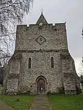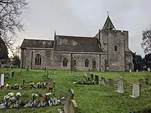 Construction of the church began in the 11th century; it is built of a mix of local ragstone and tufa with a roof covered in plain clay tiles. The large square tower on the west end is of two levels with broad buttresses and quoined corners of tufa. The north and south sides of the tower have windows with semi-circular heads and the west side has two lancet windows and a pointed arched door. The roof level has a battlemented parapet with a timber spire built in 1963 in the style of an earlier 15th-century spire.[1] The church clock was built in the 1730s and the tower contains a ring of ten bells; nine dating from the 1750s with the tenor bell cast in 1617.[2]