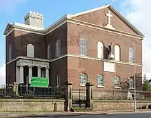 The church is constructed in brick on a stone base, with stone dressings and slate roofs. It is in Neoclassical style, with two tiers of round-headed casement windows. The plan is rectangular, with a short two-storey transept on each side, and a low block at the east end containing vestries. A square louvred belfry stands on the roof of the north transept. A stone band runs round the church between the storeys, and around the top is a frieze and a cornice. The west end is in four bays. Above the windows in the lower storey is a plaque. The central two windows in the upper storey are blind, and between them is the free-standing statue of Saint Patrick on a plinth.[2][3] The statue was moved from the St Patrick Insurance Company building in Dublin in 1827, when it was presented to the church by James Branker, a sugar refiner.[3] At the top of the west front is a pedimented gable, which contains a Calvary cross.[2] On the west sides of each transept is a porch fronted by four Greek Doric columns.[3]