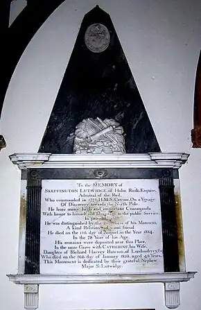 There are memorials to various members of the Brocklebank family, and the Lutwidge family. The memorial to Admiral Skeffington Lutwidge is particularly interesting. He commanded HMS Carcass on the 1773 Phipps expedition towards the North Pole, with a young Horatio Nelson on board. During the expedition Nelson had seen and given chase to a polar bear on the ice, but was ordered back from this dangerous pursuit by Lutwidge. A plaque by the font is in memory of another Lutwidge: Robert Wilfred Skeffington-Lutwidge, who was a commissioner in lunacy. The plaque tells the tragic tale of how he died after being hit on the head by a lunatic.[8] There are several decorative wall plates dating up to the 20th century executed by Morris & Co.