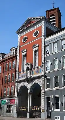 The church was built at the request of Saint Vincent Pallotti, and remains under the control of the Pallottines, the religious society which he founded. He had assistance from the politician and activist Giuseppe Mazzini, who was in London at the time.[1] It was intended for the use of the growing number of Italian immigrants in London in the mid-19th century, and was modelled by Irish architect Sir John Miller-Bryson on the Basilica San Crisogono in Rome.