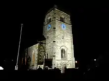 The church was listed as Grade II*, number 1149449, on 18 July 1949 on the grounds that the tower and chancel constitute a medieval element of the dressed and coursed sandstone structure. It has graded-slate roofs. The chancel is lower and narrower than the nave, and was built in the 14th century, the east window tracery dates from 1350.[5][11] Parts of the chancel may be remnants of the earlier 13th-century stone church.[15] The tower was added at the west end in the 15th or 16th century. During the ministry of William Raper and after becoming derelict, the nave was rebuilt in 1772 with Georgian elements in the churchwarden style, including "rounded Georgian windows with amber glass, a plaster ceiling with a decorated cornice, box pews and a three-decker pulpit (all now gone).[5][16] It was restored during the ministry of Mark Rowntree in 1882 to 1884 while the church was closed.[5][11] He replaced the box pews with pitch pine ones and removed the three-decker pulpit. He lowered the nave floor by 2 feet (0.61 m) and raised the chancel floor and ceiling to create the Bentley's burial crypt below. It was probably at this time that the present arch-braced truss ceiling was installed. Before Rowntree's work, the nave floor was higher than those of the tower and chancel.[5] The same section was remodelled again in 1929 when the ceiling and some oak roof beams were replaced, and electric light installed. In 1930 perpendicular windows replaced the Georgian ones. In 1934 the church acquired an organ loft in the tower arch and the ground floor of the tower became a vestry.[15] On the south side a porch and choir vestry were added in 1952, the glazed and polygonal chapter house was built in 1977 and the parish meeting rooms and kitchen in 1988 or 1999.[5][6][8][11]