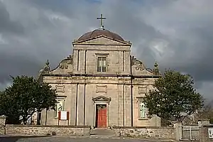 The east front is based on the design of Santa Maria della Vittoria in Rome.[2] It has three bays, separated by pilasters, the central one advanced slightly. The side bays, topped with volutes and finials, have corniced central panels which have inset round-topped niches housing statues.[1][2] The pedimented entrance is in the central bay.[1] An inscription reads Columna et Firmamentum Veritatis.[1] Behind the east front, where the transepts meet the nave, is a large, octagonally faceted copper dome,[2][3] with oval windows in each face.[3] The dome is made of concrete, covered with sheets of copper,[3] and is topped with a cross finial.[1] The sides and rear of the church are much simpler than the front.[3] Made of granite rubble, each of the transepts has three round-arched windows at their gable ends, and there are lean-to side aisles with rectangular windows.[3] The western end of the building serves as a presbytery, with two storeys and bay windows.[3]