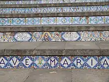 The figurative themes of the ceramics are floral or geometric, and represent the Arab, Norman, Angevin-Aragonese, Spanish, Renaissance, Baroque, eighteenth-century, nineteenth-century and contemporary styles.[3] The designs on the tiles reflect ceramic style progressively from the 9th century to the 19th century, with the oldest style at the bottom of the stairway and the latest at the top.