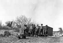At Khan Yunis wells produced 100,000 gallons of water a day for the EEF.[77] The springs at Esani and Shellal were developed to give about 14,000 gallons an hour, and 500,000 gallons were stored in a natural rock basin. The wells at Deir el Belah were connected up with the trenches south of Gaza. Pumping stations were erected, and deep bore wells sunk at intervals.[75]
