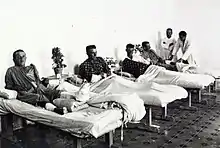 The Tent Division also provided immediate treatment for the wounded: redressing all wounds, and performing emergency surgery. The division ran the Field Hospital, consisting of between one and four hospital tents, each accommodating up to 14 patients, where men lay on mattresses either on the ground or on light, wicker supports, or on stretchers.[81][Note 9]
