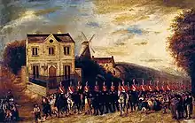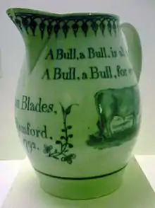 The bull running in Stamford was the subject of an 1833 campaign by the Society for the Prevention of Cruelty to Animals. Some Stamford residents defended their ancient custom as a "traditional, manly, English sport; inspiring courage, agility and presence of mind under danger." Its defenders argued that it was less cruel and dangerous than fox hunting, and a local newspaper asked "Who or what is this London Society that, usurping the place of constituted authorities, presumes to interfere with our ancient amusement?"[1] A riot trial in July 1837 tried only five men and convicted three; William Haycock, John Pearson and Richard for participating in the Bull running in November 1836.[10] This inspired some in the town to plan a bigger event for the next year.[1] The mayor of Stamford – at the direction of and with the support of the Home Secretary – used 200 newly sworn-in special constables, some military troops, and police brought in from outside, to stop the bullrun of 1837, but it happened anyway. The bull and the people ran through the security line, a riot ensued, and in the end no one was killed (not even the bull, which turned out to have been supplied by or stolen from a local lord, discreetly unnamed in contemporary reports).[1]
