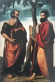 The three works' attribution to Pordenone survived until 1909, when Claudio Gamba noticed similarities between Madonna and Moretto's style,[2] followed by Giuseppe Fiocco's definitive attribution of the standard and the Madonna to Moretto in 1921.[3] Subsequent studies have attempted to place the works in Moretto's varied early oeuvre.[4]
