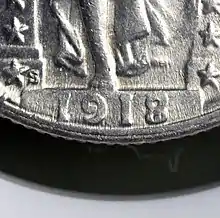 It had long been a practice at the Mint to recut unused dies at the end of the year to show the following year's date. During the 18th and 19th centuries, die cutting was difficult and expensive. As making dies became cheaper and easier, the practice mostly died out around the turn of the 20th century. However, a 1917-S Type 2 die, unused by the San Francisco Mint, was recut and used to strike several thousand 1918-S quarters.[56] Few are known, and the coins command prices in the low thousands even in well-circulated conditions.[57]