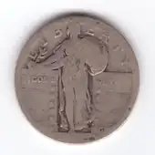 No quarters were struck in 1931; there was no call for them in commerce due to the Depression.[61] Since 1930, there had been an effort among those organizing the commemoration of the bicentennial of George Washington's 1732 birth to seek a Washington half dollar, to be struck as the regular issue for 1932. When a bill for a Washington commemorative was introduced to Congress in February 1931, it changed the quarter rather than the half dollar. While the reasons for the change were not recorded, the House Coinage Committee issued a memorandum stating that "the new design would replace the present type of quarter dollar", was on "a popular denomination" and "would replace an unsatisfactory design now being issued".[62] Congress passed the act on March 4, 1931,[62] and the new Washington quarter began to be struck in 1932, ending the Standing Liberty series.[63] Nevertheless, many Standing Liberty quarters remained in circulation until silver coins began to be hoarded by the public in 1964, prompting the change to base-metal pieces.[64]