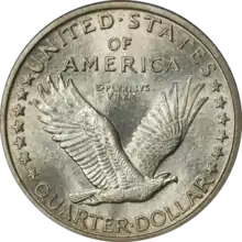 Throughout late 1916, the Mint was intensely busy first sharpening the design to be used in 1917, and then in large-scale preparation of dies to begin striking the new quarters on a massive scale once the new year began.[37] Small change was in great demand: Mint officials had hoped not to strike any Barber pieces in 1916, but eventually had to do so in large quantities to satisfy the need.[40] Once new quarters were struck, fearing the new pieces would be hoarded (especially the low-mintage 1916 coin), von Engelken instructed that no pieces be released without his order. Small quantities of the new quarters were available, however, to officials and to prominent numismatists. MacNeil, who had not heard from the Mint about his coins since the formal acceptance of his dolphin design, read in the newspaper in early January that the Mint was starting to strike his quarters. He wrote to von Engelken on January 6, enclosing a $5 money order, and was sent 20 of the new pieces. After seeing what the Mint had done to his designs, MacNeil wrote again to von Engelken, criticizing the artistic nature of the changes in such strong terms that the Mint Director continued his embargo on the coins' release. The sculptor pointed out, for example, that the lower position of the eagle made it appear about to land—with its talons in a position only assumed at great heights. Von Engelken feared that should the sculptor's objections become public and not be addressed, the Mint would be exposed to ridicule. MacNeil visited the Philadelphia Mint and its engraving department on January 10. No records of his visit are extant, but von Engelken telephoned from Washington to Philadelphia the same day to ensure that the new quarters did not leave the Mint.[37]