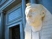 The mausoleum has sphinxes on both the front and the back. The back ones are Greek and female with naked breasts. They were originally on the front but the Stanfords disapproved of them and replaced them with Egyptian style male sphinxes and moved the female sphinxes to the back.
