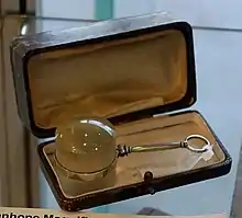A Stanhope lens is a simple, one-piece microscope invented by Charles, the third Earl of Stanhope. It is a cylinder of glass with each end curved outwards, one being more convex than the other. The focal length of the apparatus is at or within the device so that objects to be studied are placed close to or in contact with the less curved end. Because its construction is simple and economical, it was popular in the 19th century.[1] It was useful in medical practice for examining transparent materials such as crystals and fluids.[2]