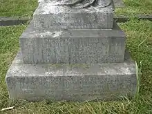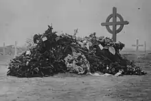 After a lull over the summer, in November 1917, whilst his forces were engaged at Ramadi and Tikrit, Maude contracted cholera (which some sources claim to have been caught from drinking unboiled milk) and died in the same house as German field marshal von der Goltz nineteen months earlier. General Marshall succeeded him. His body was buried in Baghdad (North Gate) War Cemetery.[15] His initial grave and marker was replaced by a more elaborate structure and then enclosed in a small mausoleum structure on the walls of which is mounted the standard Commonwealth War Graves Commission headstone.[16][17] The epitaph on his CWGC gravestone reads: "'I am the resurrection and the life'. He fought a good fight. He kept the faith."[15] In March 1918 parliament agreed to a request from the King that he grant the sum of £25,000 to his widow.[18]